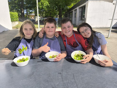 verkosten. Es gab einen köstlichen Salat für die vier Gärtnerfreunde. Überdies war auch noch genug für den Schulkantinekurs da, der ein leckeres Mittagessen aus den frisch geernteten Zutaten
